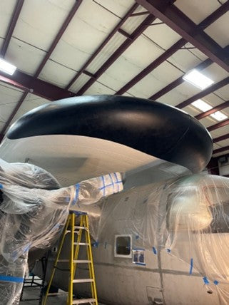 The radar dome’s bottom surface has been given its final coat of coat of the white original finish. The leading edge’s Rain Erosion Resistant black coating has been applied to the dome’s front