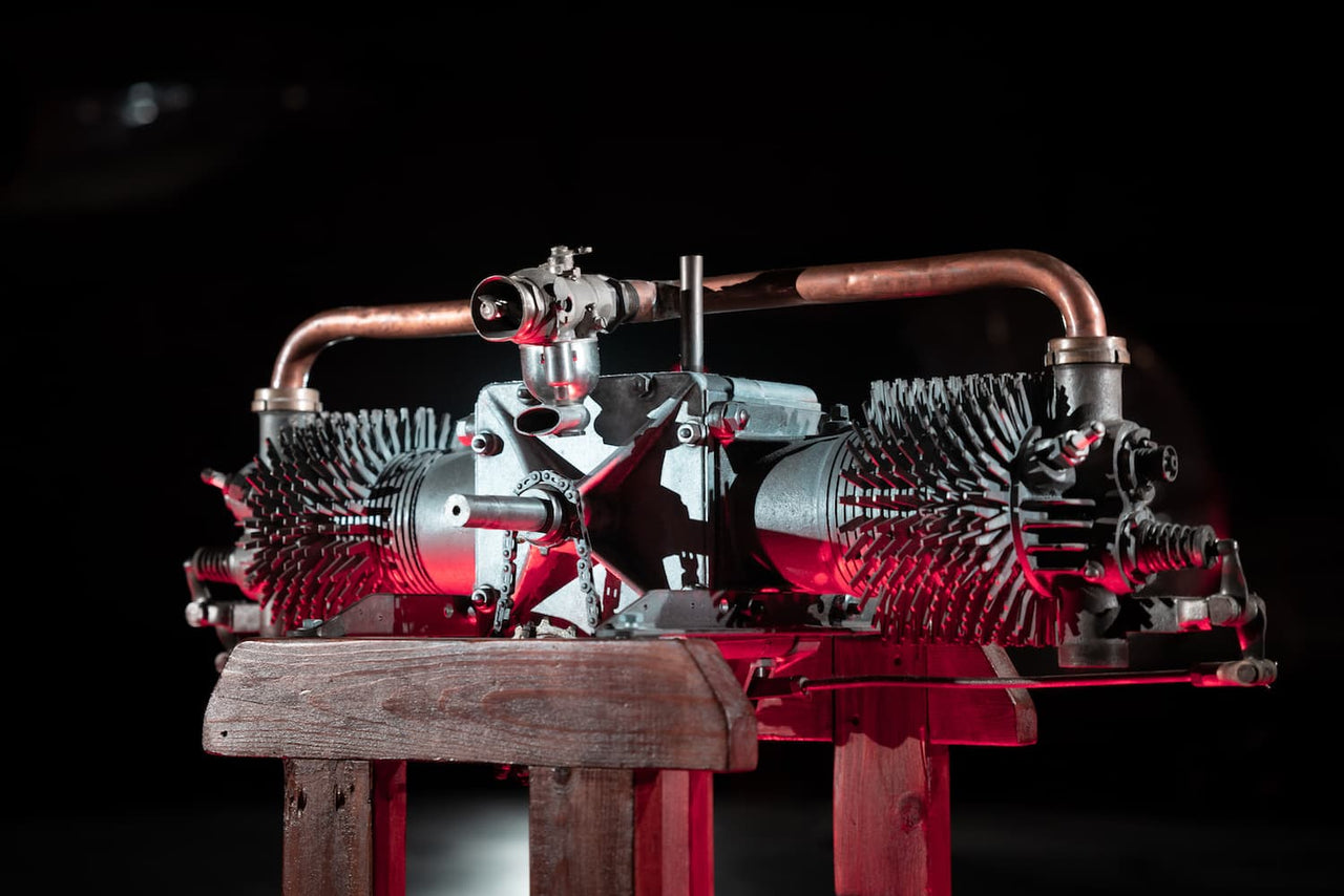Designed and built by George F. Smith of New Britain, Connecticut, this engine is the oldest surviving aircraft engine built in Connecticut. The cylinders were modified from those of a Corbin automobile, the crankshaft was taken from a Franklin automobile, while the aluminum crankcase and off-set connecting rods were Smith's own design.