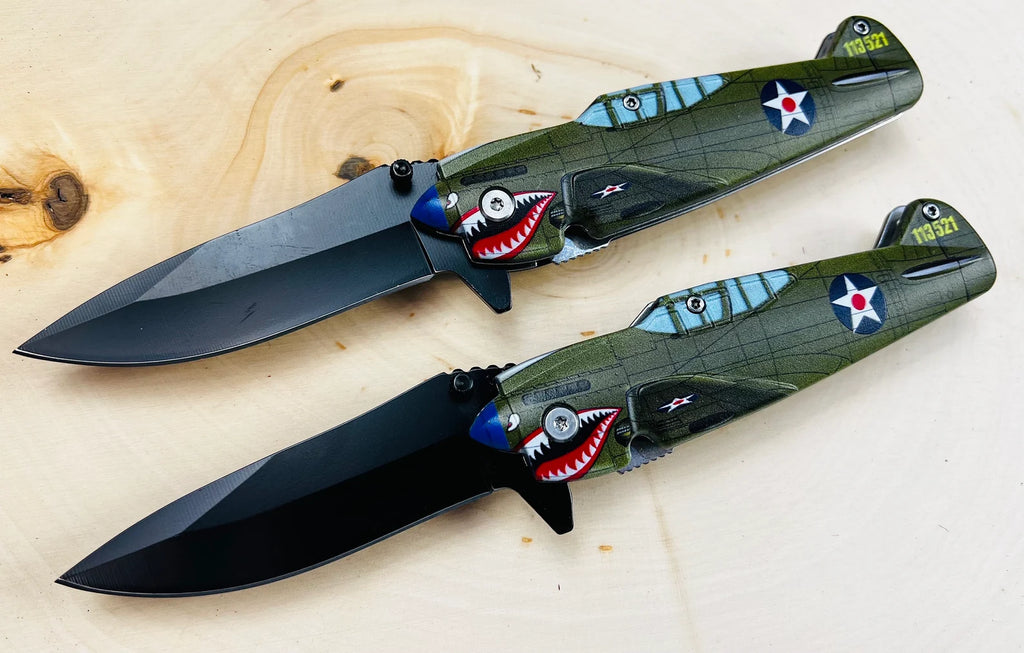 Bomber Plane design Spring Assisted Pocket Knife with clip in a laser engraved wooden gift box. This Knife is strong and sharp, the unique design on the front and back make it a cool addition to anyone's knife collection.
